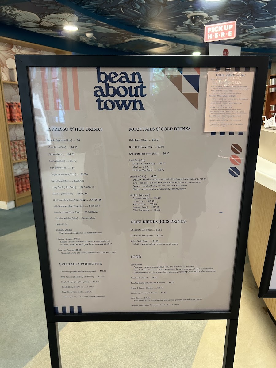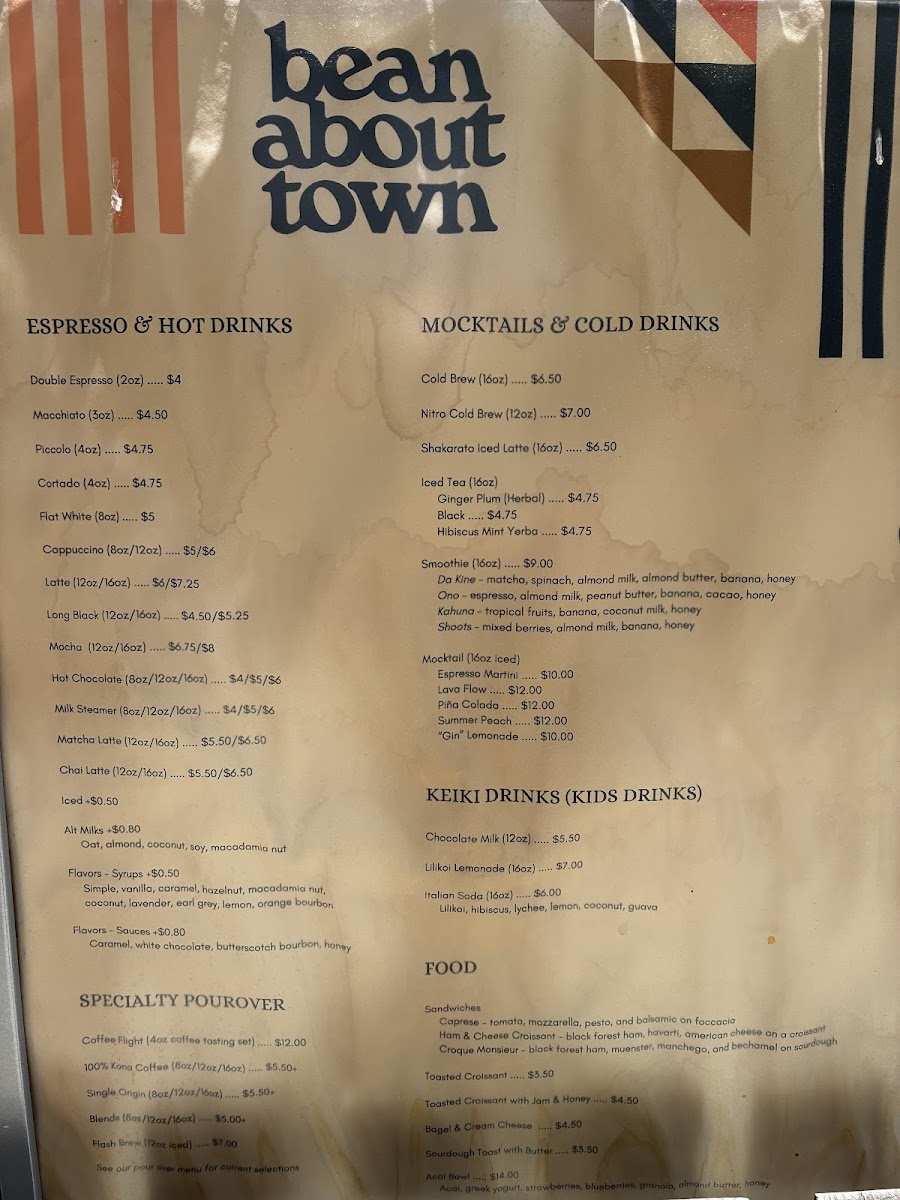 Welcome to Bean About Town, a chic café nestled in the vibrant heart of Waikiki. Located at 330 Royal Hawaiian Ave, this café presents a delightful menu celebrating the best of specialty coffee. The atmosphere is inviting, with ample seating options ranging from cozy armchairs to convenient counters equipped with outlets—ideal for both relaxation and productivity.